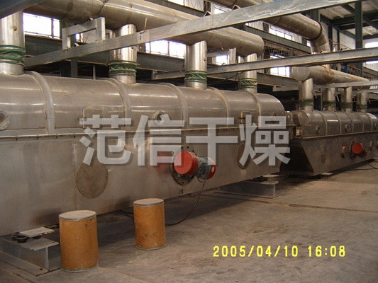 物料自进料进口进入机内,在振动力作用下,物料沿水平面流化床抛掷,向前连续运动,热风向上穿过流化床同湿物料换热后,湿空气经旋风分离器除尘后由排风1:3排出.干燥物料由排料进口排出。